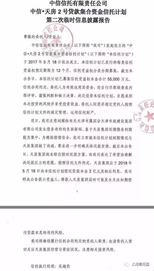截至本公告日,天房集团尚未给出按时还款方案,向我司表达了希望协商解决还款压力的意愿。按照信托文件约定,天房集团应于2018年5月18日向本信托计划偿还贷款本金2亿元及相应利息。我司特此公告提示受益人,借款人天房集团届时可能存在无法如期偿付贷款本息的违约风险。”