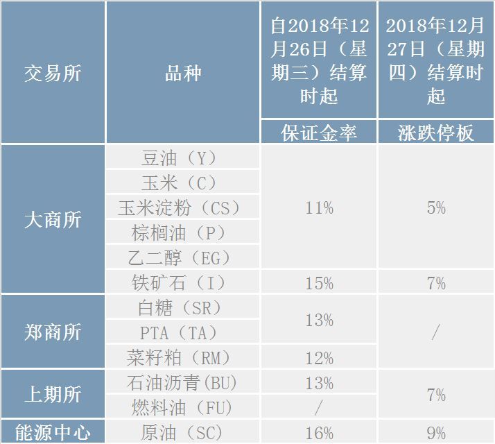 自2018年12月26日(星期三)结算时起,大商所、郑商所、上期所、上期能源进行保证金调整,自2018年12月27日(星期四)结算时起,进行涨跌停板幅度调整。