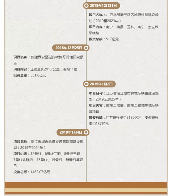 2019年开工第一周,国家发改委先后批复了《江苏省沿江城市群城际铁路建设规划(2019-2025年)》和《武汉市城市轨道交通第四期建设规划(20192024年)》。两个规划涉及投资3786亿元。