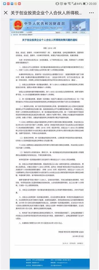 2018年12月12日,国务院常务会议决定实施所得税优惠促进创业投资发展,这一政策加大了对创业创新支持力度,创投基金个人合伙人税负将只减不增。2019年1月24日财政部正式发布关于创业投资企业个人合伙人所得税政策问题的通知。创投税收新政正式落地!2019年1月1日起至2023年12月31日,创投企业个人合伙人可按20%税率缴纳个人所得税。
