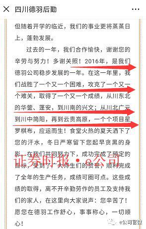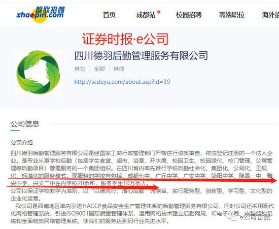 根据四川德羽后勤微信公众号披露,该公司创建于2009年,前身是“四川众呈投资管理有限公司”和“四川宏学教育后勤管理服务有限公司”,于2015年4月合并重组为现在的四川德羽。该公司是专业从事学校后勤管理服务的一个集团组织,在四川率先推行学校后勤社会化、集团化、公司化服务模式,现在服务的学校和企业单位共有30余所,服务学生10万余人。