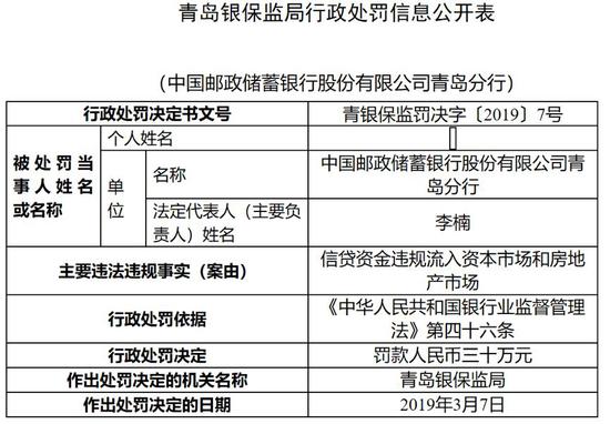 中国邮政储蓄银行青岛分行信贷资金违规流入资本市场和房地产市场被罚30万元。青岛银保监局作出上述处罚时间均为3月初。