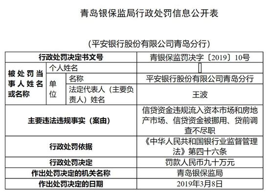 值得注意的是,近期已有相关银行因此受到处罚。青岛银保监局本月发布的行政处罚决定显示,平安银行青岛分行因信贷资金违规流入资本市场和房地产市场、信贷资金被挪用、贷前调查不尽职,被罚90万元。