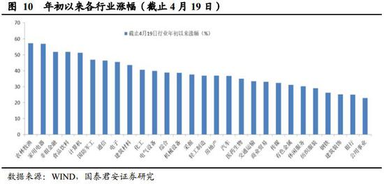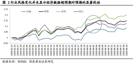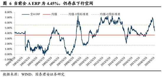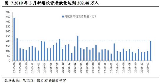 政策边际收紧对估值形成压力,而改革预期升温将对冲形成估值支撑。综合央行和政治局表述可以看到,政策对于节奏和侧重点表述发生变化。前期市场预期经济下行压力加大下,央行会降息,而随着通胀数据的公布,3月CPI同比上涨2.3%,前值为1.5%,市场对于货币政策放松预期已经下降。基于国泰君安证券研究测算,猪周期回升下最高或推高CPI达2-2.5个点,而增值税预计年内将下拉CPI0.3-0.5个点,温和通胀有利于稳定宏观杠杆,综合来看CPI上行幅度预计不会引致货币政策转向收紧。由此来看,下半年降息、降准概率在下降,这将对市场估值形成一定抑制,但我们认为风险溢价在改革驱动下将对估值形成对冲式支撑。1)政策层面提出“供给侧结构性改革的办法稳需求”,预计后续促进“高质量发展”相关政策出台可期,近期市场对于促消费政策加码预期升温,也是其中一部分;2)当前美元兑人民币汇率稳定维持在6.7水平,在美国经济边际弱化而中国经济改善背景下,从国际比较视角来看,有利于人民币资产,A股5月份即将迎来MSCI第二次扩容,将对股市形成支撑;3)资本市场建设制度完善,有利于提振市场中长期信心。国内科创板继续加速推进,预计6月份迎来第一批上市公司面世,中金所放宽股指期货交易限制。整体来看,市场风险偏好整体仍维持积极,从风险溢价角度看,当前全A ERP为4.45%,并未显现出明显的调整压力。实际上,2019年3月新增投资者数量为202.48万人,表明投资者入市情绪仍维持高位。