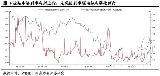 另一方面,政策层面边际上发生趋向收紧的迹象,无风险利率出现小幅上行,也增强了投资者观望情绪。与2018年四季度相比,央行2019年一季度货币政策执行报告重提“货币供给总闸门”,“加大逆周期调节力度”改为“保持战略定力,坚持逆周期调节”,“广义货币M2和社会融资规模增速合理增长”改为“广义货币M2和社会融资规模增速要与国内生产总值名义增速相匹配”,央行货币政策强调的侧重点略有变化。4月政治局会议相对2月份而言,经济形势判断的严峻程度下降,经济工作目标没有再提“六个稳”,对于“高质量发展”等中长期目标更为强调,“以供给侧结构性改革的办法稳需求,坚持结构性去杠杆,在推动高质量发展中防范化解风险,坚决打好三大攻坚战”。综合来看,政策表述在边际上出现了相对前期取向收紧的迹象,投资者担忧情绪有所升温。结合利率市场来看,截止4月19日,10y国债收益率上行至3.37%,较3月31日PMI数据公布时点上行了30个bp,而银行间同业拆解利率也进入到阶段区间上沿。综合来看,随着政策边际调整,无风险利率端市场驱动力有弱化可能。