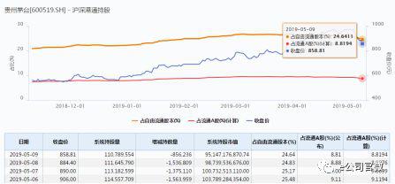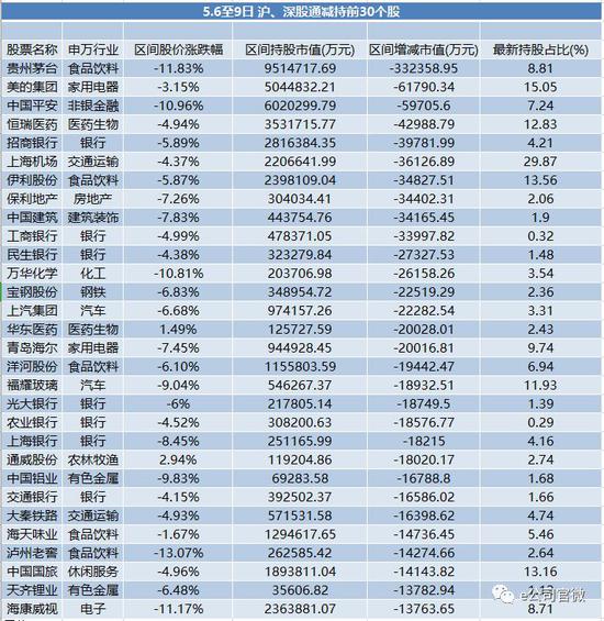 作为成交活跃股,贵州茅台在本周前四个交易日内股价跌幅超过10%,直至5月10日公司股价涨幅超过5.63%报收于907.12元/股;期间沪股通巨量净卖出贵州茅台,累计达48亿元,期间有3个交易日均创史上单日最大规模,最新持股比例已降至9%以下。