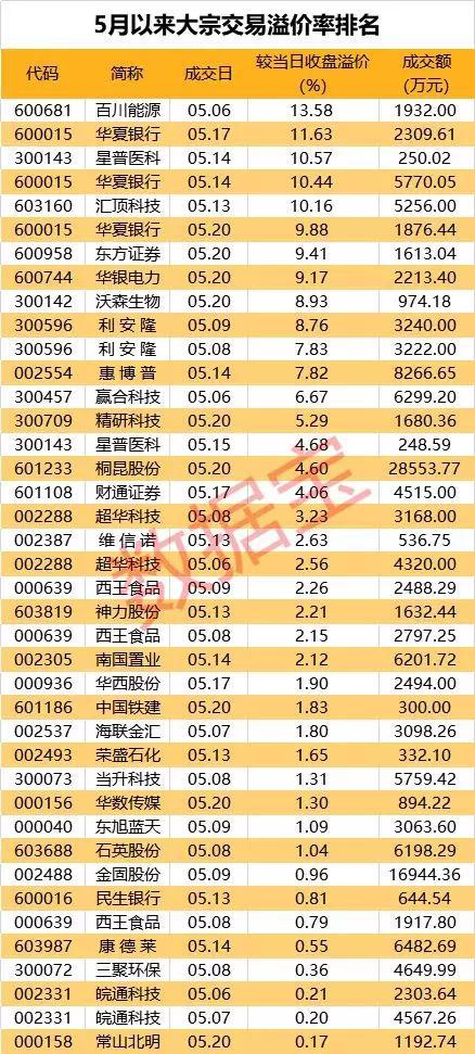 5月以来,沪深两市共有206家公司进行了大宗交易,累计成交150.35亿元,其中32家公司发生了溢价成交。