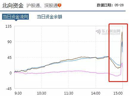 截至5月28日收盘,A股三大股指小幅收涨。其中,沪指盘中曾冲高回落,但在尾盘呈现“V字”拉升,收报2909.91点,上涨0.61%。而尾盘参与买入的资金中就包含此前持续净流出的北上资金。