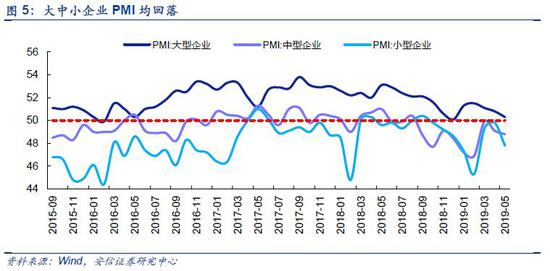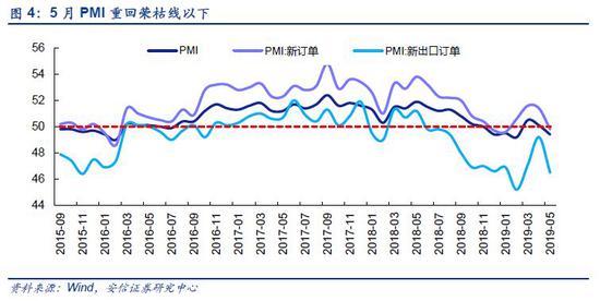 5月PMI重回荣枯线以下,经济下行压力加大。受到全球经济放缓,5月PMI较上月回落0.7个百分点至49.4%,重回荣枯线以下。其中新订单指数为49.8%,比上月下降1.6个百分点,新出口订单指数为46.5%,比上月下,2.7个百分点。