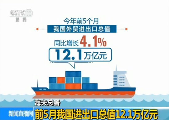 今天(10日)上午,海关总署对外公布了今年前5个月我国外贸进出口相关情况。数据显示,今年前5个月我国外贸进出口总值达12.1万亿元,同比增长4.1%,对外贸易继续保持平稳增长的良好态势。