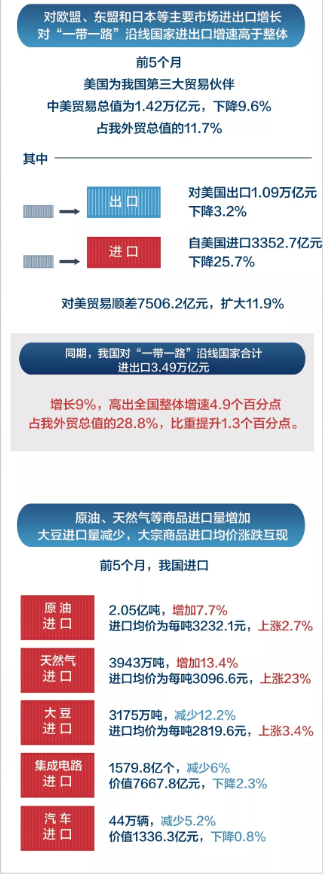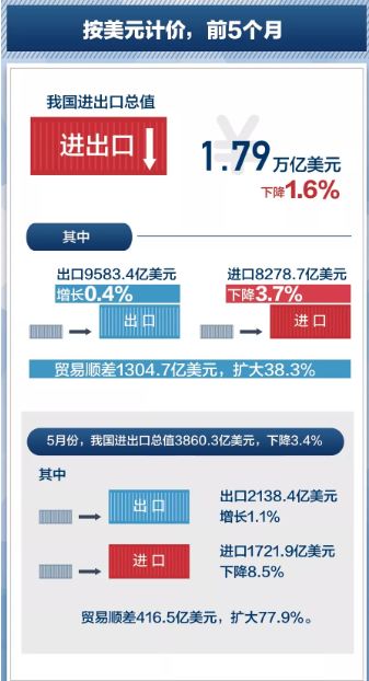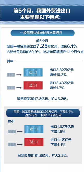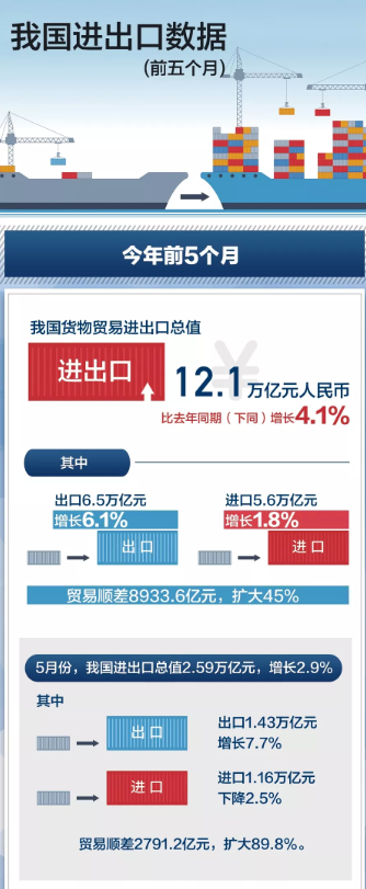 海关统计显示,今年前5个月,我国外贸进出口总值12.1万亿元,同比增长4.1%,其中出口6.5万亿元,同比增长6.1%,进口5.6万亿元,同比增长1.8%。