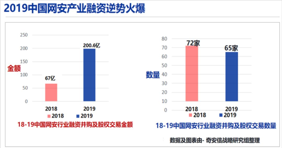 根据互联网的公开数据统计:2018年,国内网安企业72家发生过融资、被并购及股权交易事件,累计交易金额67亿人民币;2019年,国内网安企业65家发生过融资、被并购及股权交易事件,累计交易金额200.6亿人民币,其中包含4起大额股权转让和投资(奇安信37亿、美亚20亿、绿盟22亿、天融信8亿)。