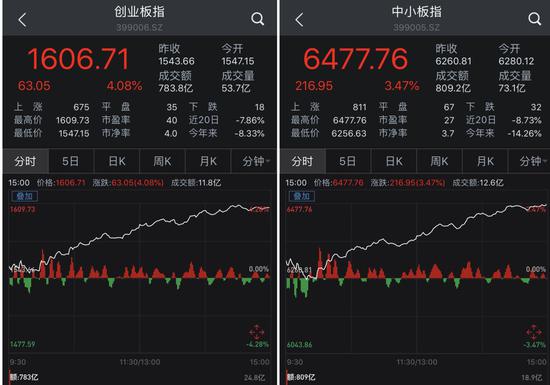 值得关注的是,今天中小创更活跃。创业板指大涨4.08%报1606.71点,日涨幅创两年来新高,其中仅16股下跌;中小板涨3.47%报6477.76点,其中仅32股下跌。