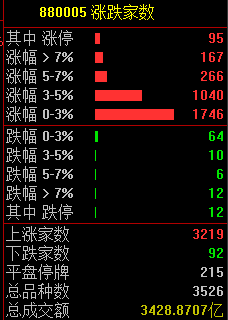 久违看到市场一片红彤彤,两市近百股涨停。数据统计显示,今天上涨的股票有3219家,创造A股上涨个股数量之最,其中涨停的个股达到95家;下跌的股票仅92家。