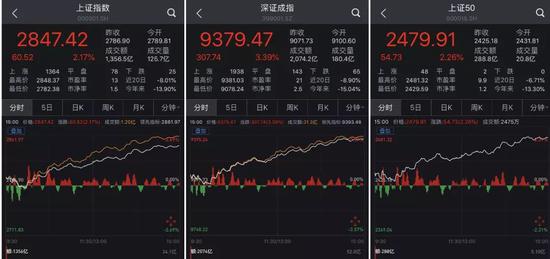 今天各大股指表现强势,集体上攻,截至收盘,上证指数涨2.17%报2847.42点,收复5日线,当日涨幅与年内最大涨幅持平;深证成指涨3.39%报9379.47点;上证50也大涨2.26%。