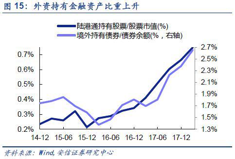 九、金融改革开放加速推进,在当前A股估值具备吸引力的背景下,有望迎来全球长期布局资金。7月2日金融委会议将金融改革开放被列在各项研究内容之首,突显其重要性。市场层面来看,自2016年以来外资持有金融资产比重持续上升。陆股通持股比例自2015年12月0.16%增长至2018年3月0.70%,上升0.54个百分点;境外持债占比自2016年3月1.38%提高至2018年3月2.65%,上升1.27个百分点。
