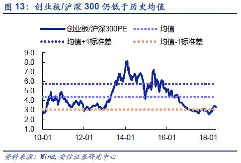 七、市场整体估值处于底部区间。绝对估值来看,市场整体处于估值底部。当前上证综指、中小板指和创业板指PE( TTM )分别为12.3倍,24.6倍和39.9倍,均处于历史低位。而从中位数来看,当前A股市盈率与市净率中位数分别为29.97倍和2.87倍,为2013年二季度以来最低,与上一轮低谷2012年三季度市盈率26.55倍和2013年二季度市净率2.45倍接近。