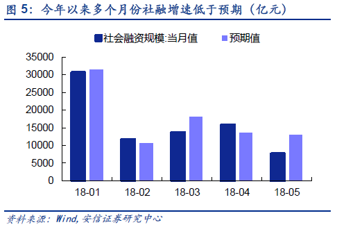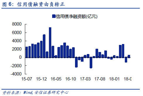 四、融资环境呈现边际改善,信用市场压力预计趋缓。今年以来,伴随金融监管趋严,去杠杆节奏有所加快,表外资金不断回表,社融增速大幅下滑。多个月份社融增速明显低于预期,且与预期落差呈现扩大趋势。5月新增社融规模中债券融资-434亿元,较4月的3925亿元环比下降4359亿元,成为拖累社融的重要因素之一。依据万得债券发行数据,6月信用债发行量达到3880亿元,较5月的3679亿元增加201亿元,信用债净融资规模由负转正,达到456亿元。另外一方面,伴随央行定向降准,前期信用利差上行趋势趋缓,企业融资难融资贵现象有所缓解,未来社融有望边际改善。