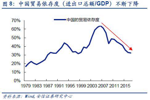 五、中美贸易摩擦对中国经济实际冲击预计有限。当前中国经济核心驱动力已经逐渐转向内需,贸易依存度从2006年开始已大幅下降,2017年贸易依存度(进出口总金额在GDP中的占比)为32%,低于加入WTO之前的2000年。而目前中国对美国出口只占中国出口总额不到19%,且贸易结构也在持续变化,新兴市场国家占比持续上升。中美贸易摩擦对于对国内经济基本面的实际影响有限。