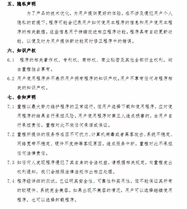 最过分的是居然还有这样的内容:“用户对此情况充分知情,且不会因此追究重橙网络的责任。”