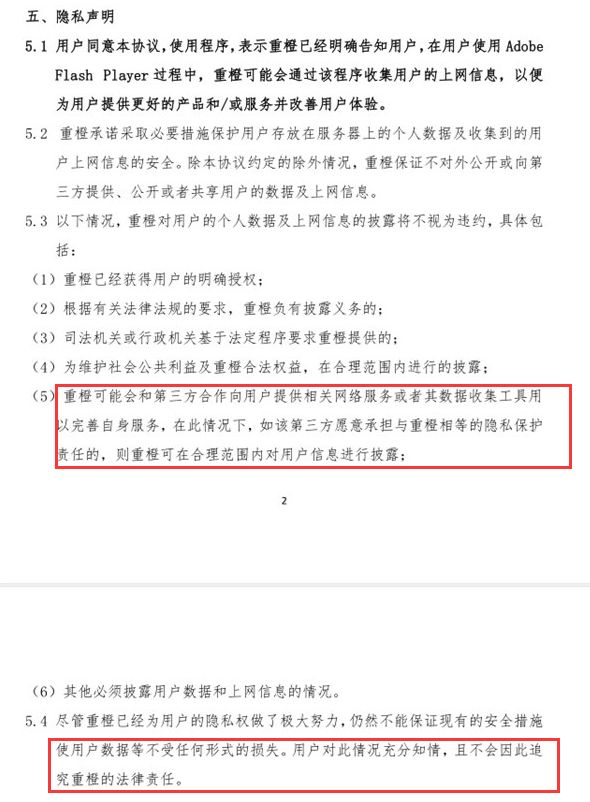 在特供版Flash Player软件的用户协议中,有着这样一条:“用户同意本协议,使用程序,表示重橙已经明确告知用户,在用户使用Adobe Flash Player过程中,重橙可能会通过该程序收集用户的上网信息。”