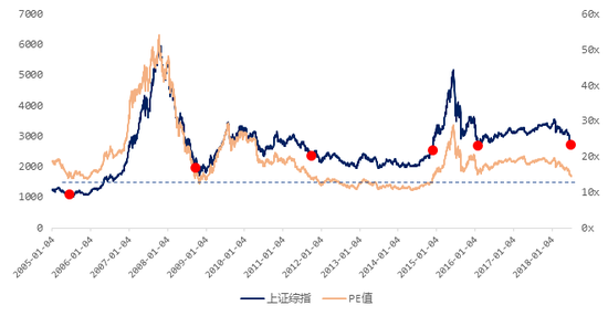 整体来看,上半年沪深股市基本处于震荡筑底阶段。上证综指自2018年1月创下阶段高点以来,至7月6日累计跌幅达到了22.54%。市场走弱主要源于内外部因素的扰动:外部不确定性压制了风险偏好,提高了市场的避险情绪;内部由于企业融资成本上升,信用违约事件时有发生,致使企业盈利预期承压。市场经过回调之后整体估值已经处于历史低位,截至7月6日,全部A股的PE值为14.5X,我们在不同时段分别选取了五个与之PE值相似的时点,分别出现在2005年7月对应上证综指1055.59点,2008年10月对应1974.01点,2011年9月对应2470.52点,2014年12月对应2856.27点与2016年1月对应2655.66点,并对市场底部特征进行比较分析。