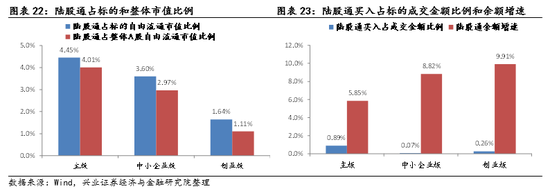 7月13日陆股通中主板、中小板、创业板占标的自由流通市值比例分别为4.45%、3.60%和1.64%,占整体A股板块自由流通市值的比例分别为4.01%、2.97%和1.11%。7月9日-7月13日,陆股通主板、中小板、创业板买入占标的成交金额的比例分别为0.89%、0.07%和0.26%,陆股通余额增速分别为5.85%、8.82%和9.91%。
