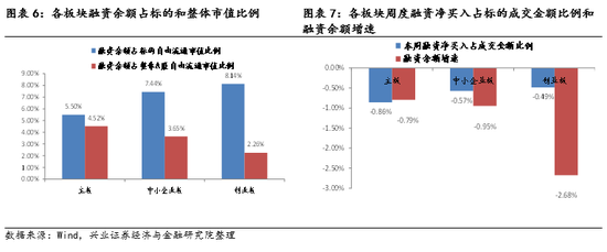 7月13日,主板、中小板、创业板融资余额占标的自由流通市值比例分别为5.50%、7.44%和8.14%,占整体A股板块自由流通市值的比例分别为4.52%、3.65%和2.26%。7月9日-7月13日,主板、中小板、创业板融资净卖出占标的成交金额的比例分别为0,86%、0.57%和0.49%,融资余额的增速分别为-0.79%、-0.95%和-2.68%。