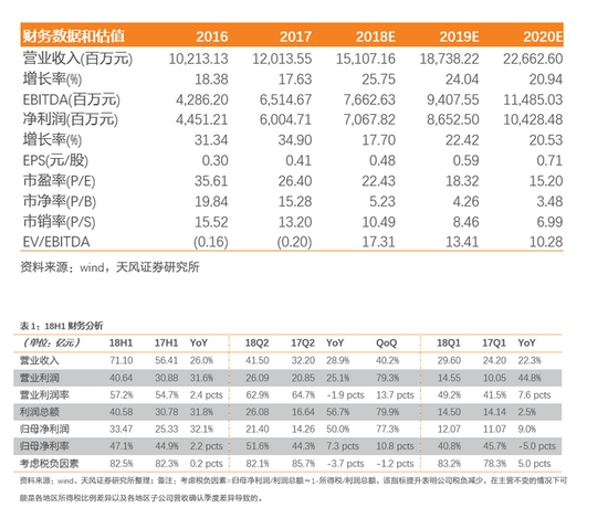 4) 以我们的盈利预测为基础,公司上半年业绩完成度高,我们自17Q2起强调“量增→营收增、毛利率略降→利润增”的渐进逻辑亦不断兑现。根据我们的盈利预测,公司18H1营收完成度为47%(=71.1亿元/151.1亿元),归母净利润完成度为47%(=33.5亿元/70.7亿元),各项财务指标与我们盈利预测亦较为接近。我们自年报点评(公司18年估值低位)起一直提醒关注公司基本面持续向好的趋势,认为收入提速能对冲毛利率下滑,阿里入股及战略合作以及业绩快报持续验证我们观点。