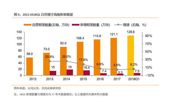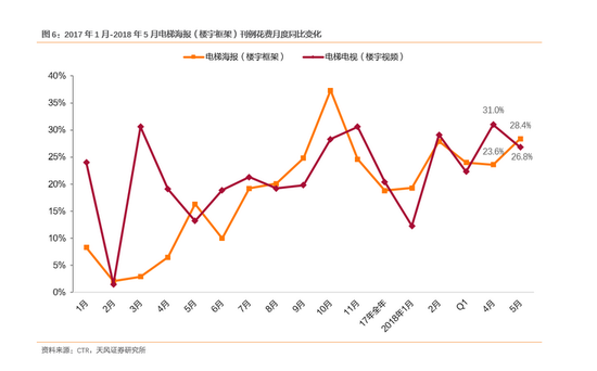 1) 营收持续增长,单季度营收增速再上一个台阶。公司18Q2单季度营收41.50亿元,同比增长28.87%(v.s. 18Q1营收同比增速22.3%),受618年中大促等带动,二季度为生活圈广告的传统旺季,营收环比增长40.20%。与CTR行业刊例花费增速较为接近,电梯海报(楼宇框架)18年4-5月同比增速为+23.6%、+28.4%,电梯电视(楼宇视频)18年4-5月同比增速为+31.8%、+26.8%。