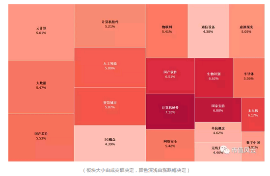 相关高新技术板块如云计算、大数据、人工智能、半导体等板块均跟涨超5%。
