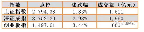 截止收盘,沪指报2794.38点,涨1.83%,深成指报8752.20点,涨2.98%,创指报1497.61点,涨3.44%。
