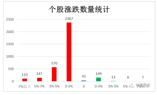 今日大盘再现三千股齐涨的景象,市场上有3194只股票上涨,只有175家下跌,与8月7日情况非常类似。涨跌幅最集中的涨幅区间为涨3-5%,有2367只股票在此区间内。