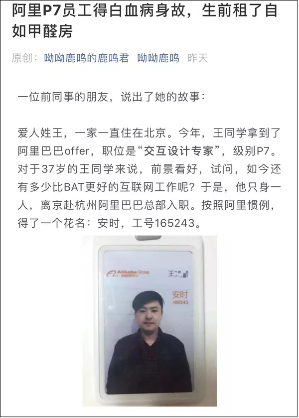 8月31日,一篇《阿里P7员工得白血病身故 生前租了自如甲醛房》的文章在朋友圈刷屏,称阿里员工王先生因病去世,家属检测其生前租住的自如房间甲醛严重超标。
