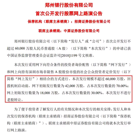 9月4日晚间,郑州银行发布公告称,本次发行规模不超过60000万股,回拨机制启动前,网下初始发行数量为42000万股,占本次发行数量的70.00%;网上初始发行数量为18000万股,占本次发行数量的30.00%。本次发行不进行老股转让。