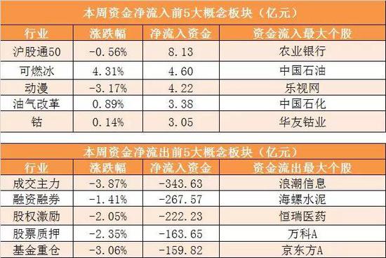 概念板块方面,本周沪股通50、可燃冰、动漫、油气改革等概念资金呈现净流入,其中沪股通50概念净流入8.13亿元居首。