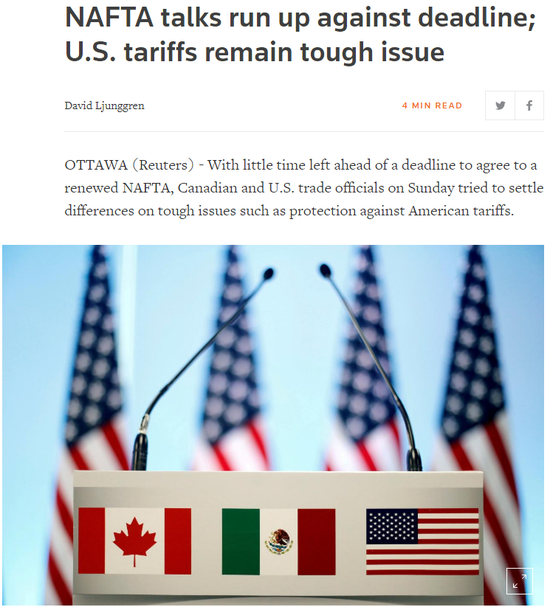 ,周日是签订更新版北美自贸协定的最后期限,加拿大和美国的贸易官员们试图解决一些棘手的问题,比如美国与加拿大的关税问题等。