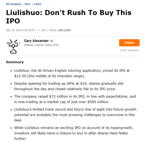 至少在当下,流利说还是一只风险非常可观的股票,而与此同时,他们的潜在回报似乎还无法与现实风险达到匹配。和许多其他中国IPO一样,流利说要在市场上真正找到与自己契合的哪部分投资者,还需要一段艰苦的摸索。现在大家还无从判断这个英语学习app的持久力如何,以及其用户群体能够成长到怎样的规模。他们最近一年的营收成长之所以这么惊人,很大程度上也是因为上一个年度几乎就没有什么营收可言。投资者最好还是先等待几个季度,看看他们接下来的每一份财报对真实成长轨迹的记录。