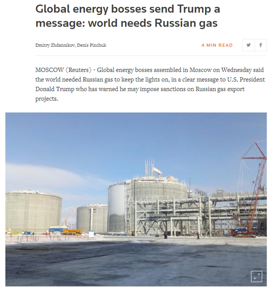 ,周三,全球能源巨头齐聚莫斯科,表示世界需要俄罗斯的天然气来维持电力供应。这是对美国总统唐纳德特朗普(Donald Trump)发出的明确信息。特朗普警告称,他可能会对俄罗斯的天然气出口项目实施制裁。