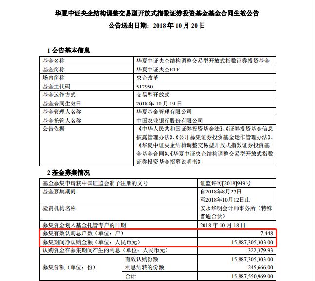 华夏中证央企ETF是7448户合计认购158.87亿元。博时央企结构调整ETF合计认购252.22亿元。银华旗下该产品募集规模超过了70亿元。