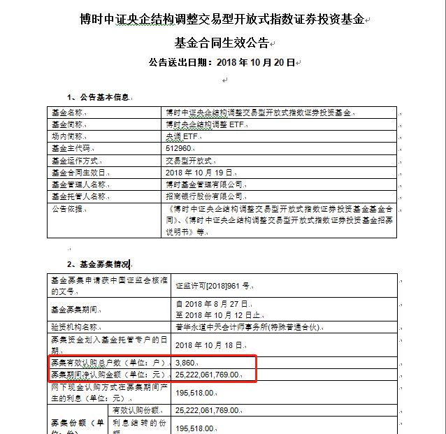 今天,华夏、博时旗下央企ETF皆发布基金合同生效公告,两只基金均自8月27日开始募集,至10月12日募集完成,公告公司的成绩单如下: