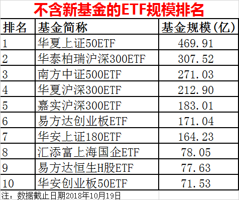 截至10月19日(本周五)收盘,目前前十大权益ETF规模排名中,宽基指数稳居ETF龙头地位。其中,华夏上证50ETF以469.9亿元规模稳居ETF龙头位置,华泰柏瑞沪深300ETF、南方中证500ETF则分别以307.5亿元、271亿元位居二、三位。