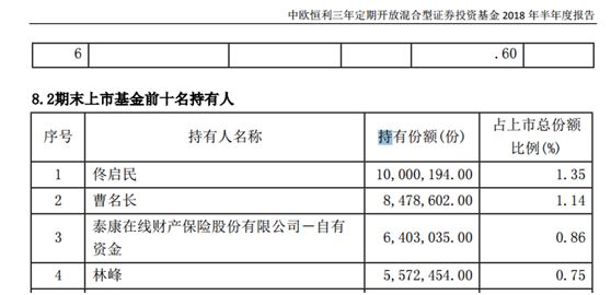 值得注意的是,曹名长二季度末持有中欧恒利基金份额847万份,成为自己管理的基金第二大持有人。