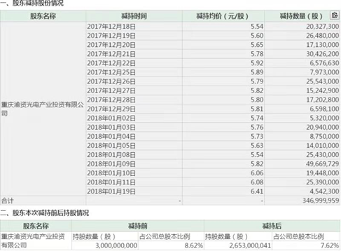 根据公告,在2017年12月和2018年1月,不到两个月的时间内,两位股东重庆渝资光电产业投资有限公司(以下简称“重庆渝资”),和合肥建翔投资有限公司(以下简称“合肥建翔”)合计减持了占公司2%的股份。