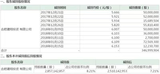 其中,重庆渝资为公司第二大股东,减持了3.47亿股。合肥建翔是公司第三大股东,也减持了3.47亿股。