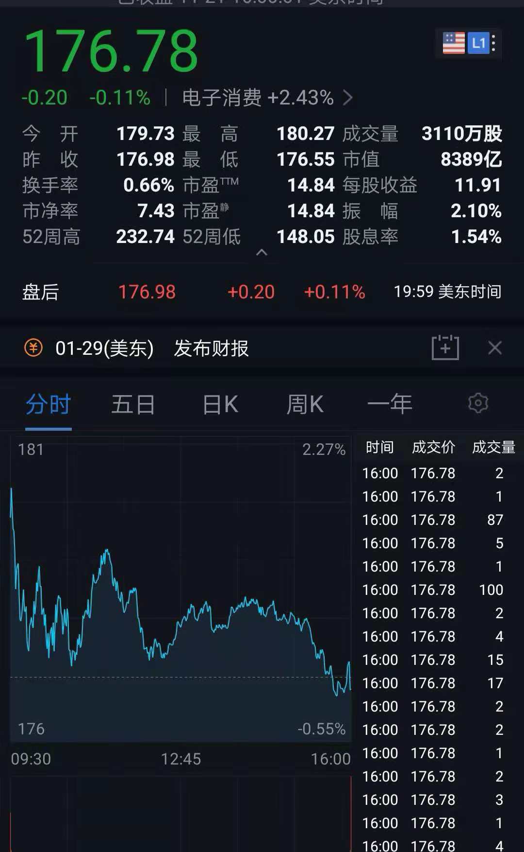 截至周二美股收盘,苹果股价为176.98美元,较前一交易日185.86美元的收盘价下跌8.88美元,跌幅为4.78%。这一价位收创今年5月3日以来的最低,也是苹果股价近6个多月的时间里首次低于180美元。