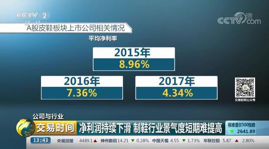 比起毛利率,鞋企的净利率下滑更值得关注。万得数据显示,2015年以来三年间,皮鞋板块的平均净利率分别为8.96%、7.36%和4.34%,连续三年出现下滑,近乎腰斩。