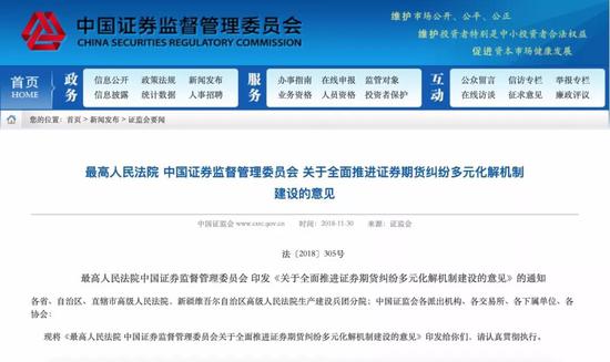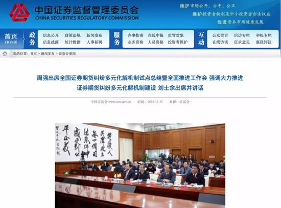 11月30日,最高人民法院和证监会联合召开全国证券期货纠纷多元化解机制试点总结暨全面推进工作会议,部署证券期货纠纷多元化解机制由试点转向全面实施。