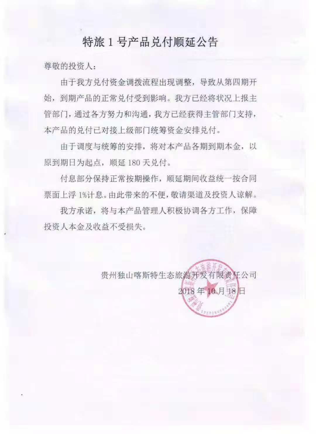据小债(ID:bondreview)了解,在报道公布当天,独山生态即出具《特旅1号产品兑付顺延公告》,表示“由于兑付资金调拨流程出现调整,本产品各期到期本金顺延180天兑付”。