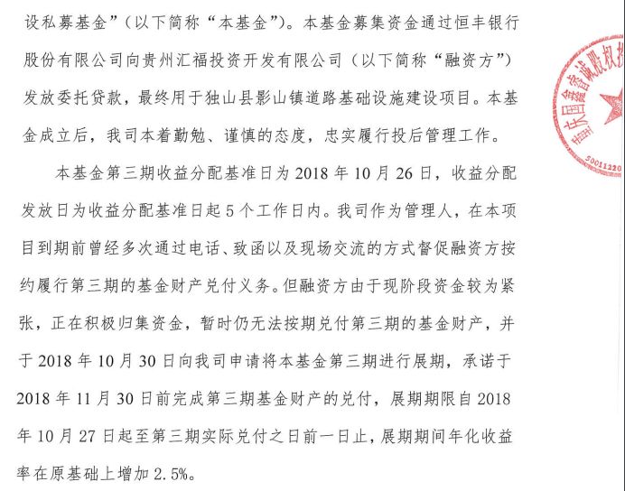 该基金管理公司官方网站于10月24日发布《关于国鑫6号贵州黔南市政道路建设私募基金延期兑付公告》指出,融资人独山汇福投资开发有限公司承诺,将于2018年10月30日前完成到期本息兑付。